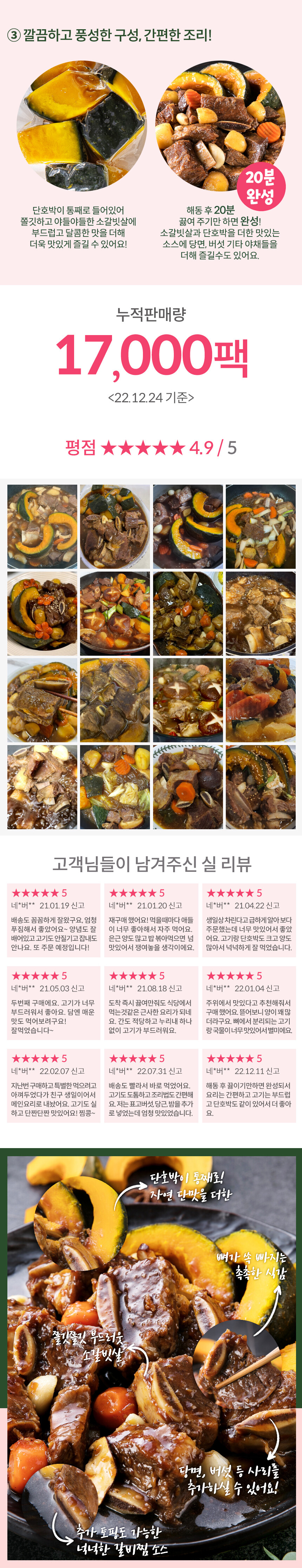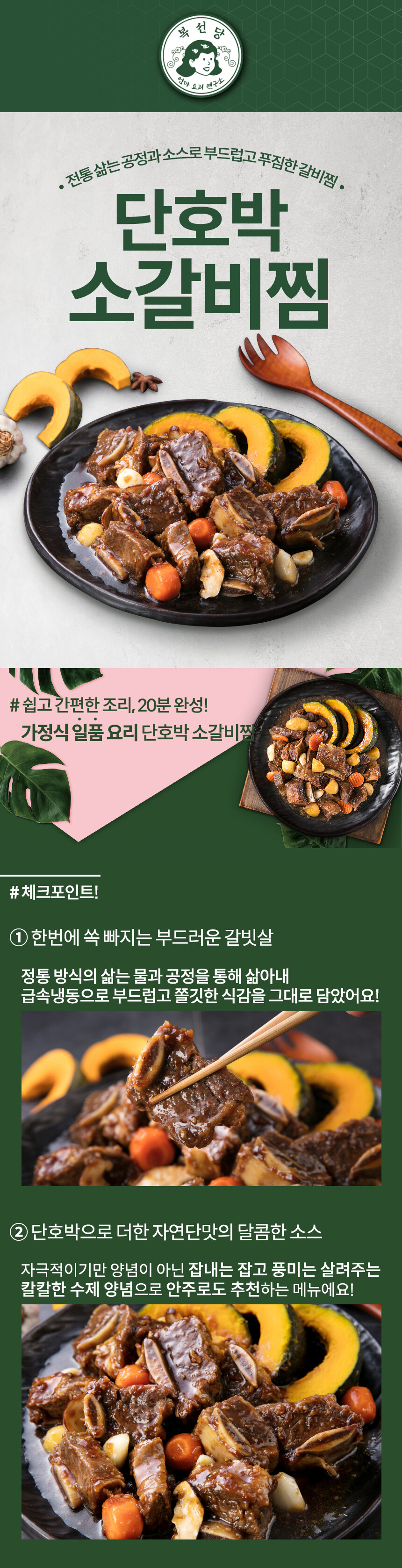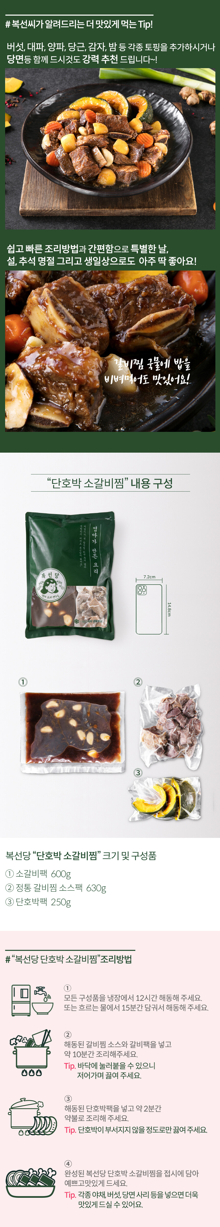 긴 조리시간과 각종 재료의 구매, 손질와 복잡한 레시피 때문에 갈비찜 요리에 번거로움이 많으셨죠? 복선당에서 준비한 "야채듬뿍 단호박 소갈비찜"은 깐깐한 눈높이를 맞춘 재료와 깨끗한 손질, 토자연만의 노하우로 만들어 맛과 퀄리티가 메인 메뉴, 특식 메뉴로 손색이 없어요!