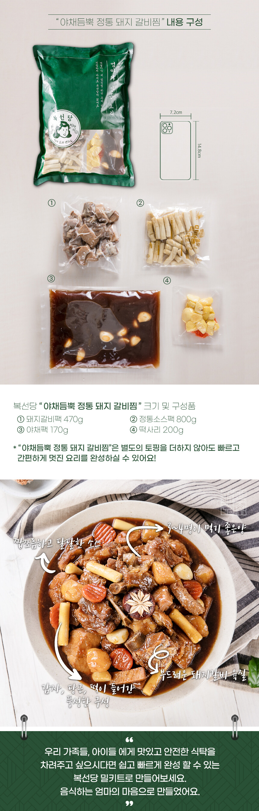 특별히 엄선한 돼지갈비에 복선당만의 특제 양념으로 만든 "야채듬뿍 정통 돼지갈비찜"은 푸짐하고 넉넉한 갈비대부터 먹기 편한 살코기와 다양한 토핑까지 다양하게 들어있어 풍성한 한상, 특별한 메인요리를 만들 수 있습니다. 특별한 날의 메인 메뉴는 물론 바쁜 일상의 든든한 식사, 캠핑, 군납, 급식으로도 손색이 없는 메뉴입니다. 취향에 따라 밥을 비벼먹어도 좋고, 별도의 채소나 면을 첨가하여 다채롭게 드실 수 있습니다.