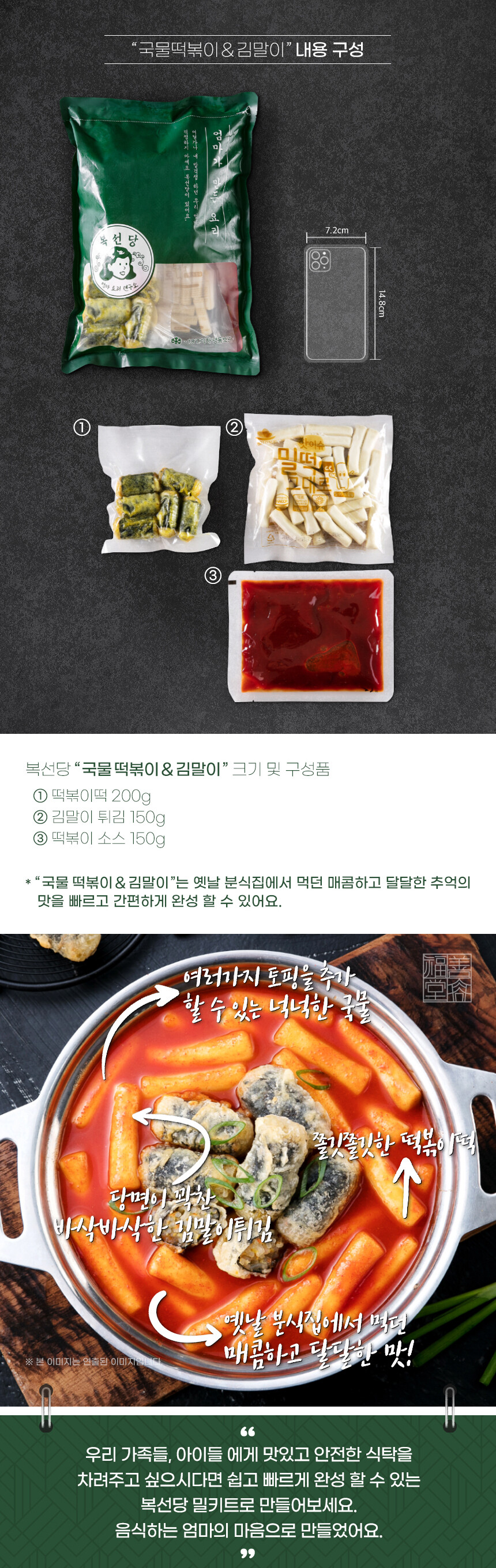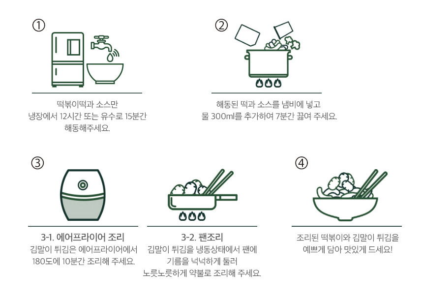 깨끗하고 위생적인 조리시설과 레시피는 물론 간편하게 완성 할 수 있도록 준비한 구성까지 더해 누구나 쉽고 빠르게 추억의 국물떡볶이를 완성하실 수 있어요. 여러가지 토핑을 추가 할 수 있도록 넉넉하게 준비된 국물과 바삭바삭한 김말이 튀김을 더해 옛날 추억의 분식집의 맛이 방울방울 떠오르는 맛이에요. 자극적이지 않으면서도 매콤 달달한 맛으로 누구나 맛있고 즐거운 시간을 만들 수 있어요. 여기에 쉽고 빠른 조리법과 멋진 퀄리티까지 더한 "국물 떡볶이 & 김말이"로 오늘의 간식을 만들어 보세요!