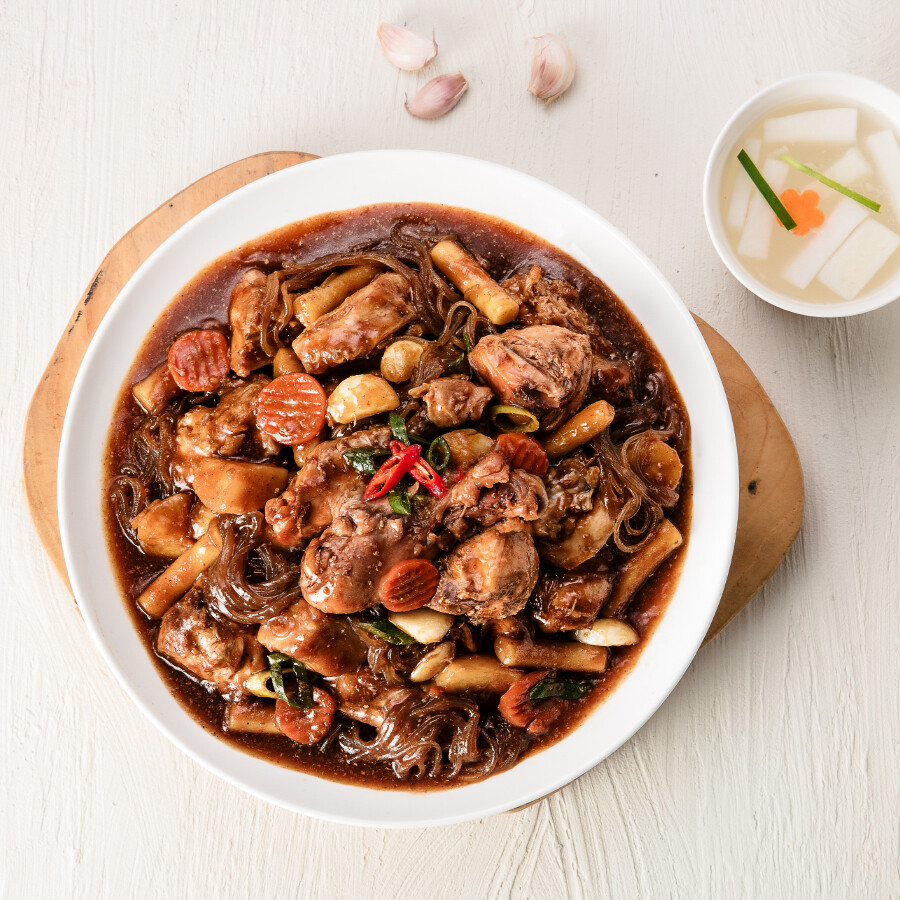 깔끔한 간장소스로 맛을 낸 복선당 안동식 간장 찜닭으로 일상의 식사를 더욱 특별하게 만들어보세요. 부드럽고 짭쪼름한 특제 소스에 수비드닭 그리고 각종 채소와 떡사리로 다양한 식감과 풍성하고 트렌디한 식단을 만들 수 있고 당면, 버섯 등을 활용한 추가 토핑으로 더 다양한 맛을 만들수도 있으며 볶음밥으로 마무리까지 맛있게 드실 수 있는 익숙하지만 특별한 레시피의 안동식 간장 찜닭입니다.