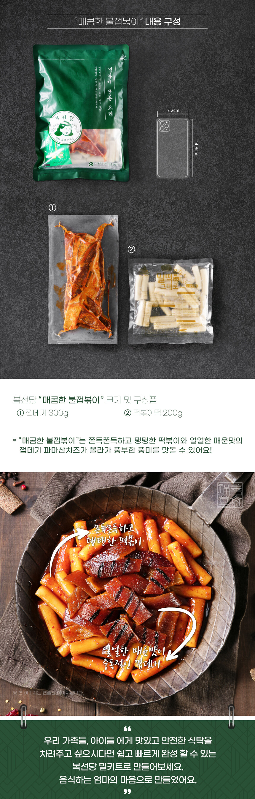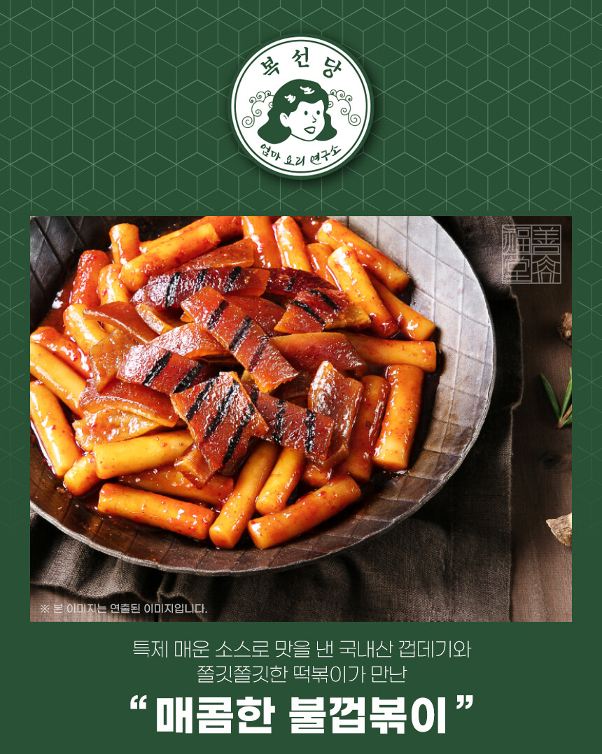 콜라겐 가득한 국내산 돼지껍데기 볶음에 쫄깃쫄깃한 떡볶이를 더해 완성한 볶음 요리, 매콤한 불껍볶이는 깔끔하고 위생적은 조리환경, 레시피로 만들어 안심하고 드실 수 있어요. 쫀득한 국내산 껍데기, 쫄깃한 떡볶이 그리고 매콤한 양념까지 더한 다채로운 맛으로 간식, 안주 등으로 활용해 보세요.