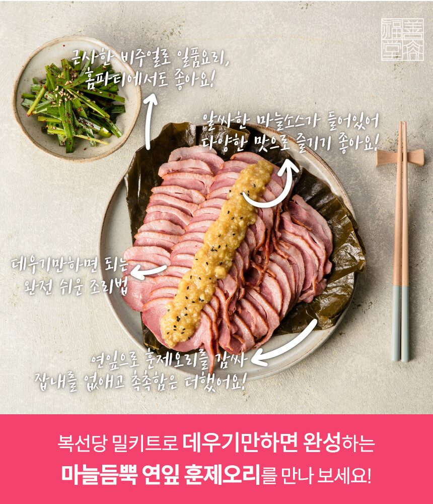 "마늘듬뿍 연잎 훈제오리"는 은은한 감칠맛의 훈제오리를 향긋한 연잎에 감싸 잡내 없이 담백하고 촉촉한 훈제오리의 맛을 즐길 수 있는 메뉴에요. 여기에 마늘 소스까지 더하면 기름기가 많은 오리의 느끼함까지 잡아 맛있게 드실 수 있어요.
