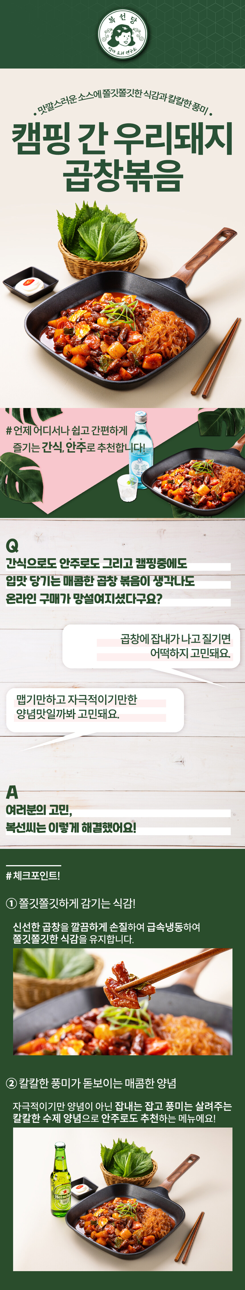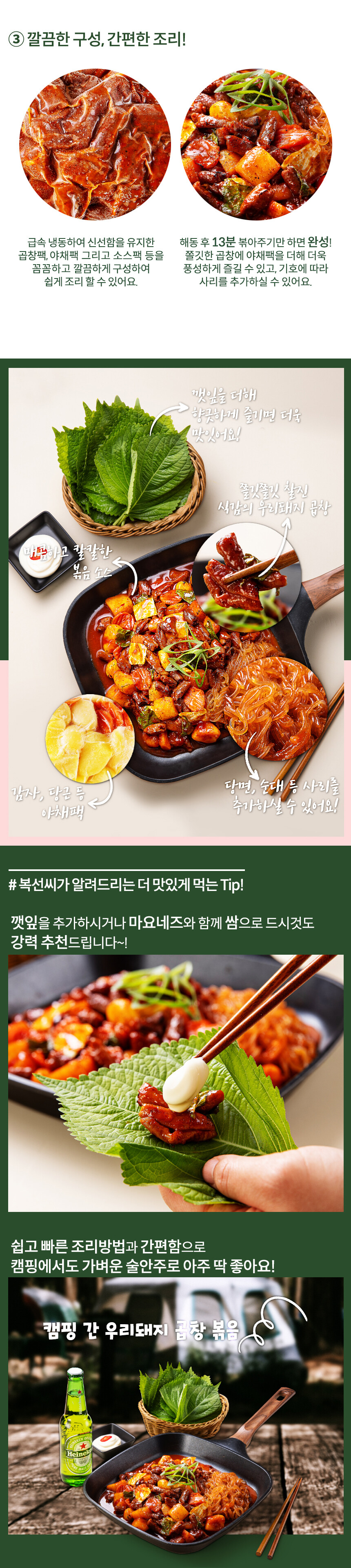 가정에서나 야외에서나 언제 어디서든 쉽고 빠르게 완성하는 "캠핑 간 우리돼지 곱창볶음"은 신선한 국내산 곱창을 깔끔하게 손질한 급속냉동하여 쫄깃쫄깃하게 감기는 식감을 유지하도록 만들었어요. 자극적이기만 매운맛이 아닌 칼칼한 풍미가 돋보이는 매콤한 수제 양념으로 맛과 퀄리티를 업그레드한 메뉴로 추가 토핑에 따라서도 다양하게 다채로운 맛으로 즐길 수 있답니다.