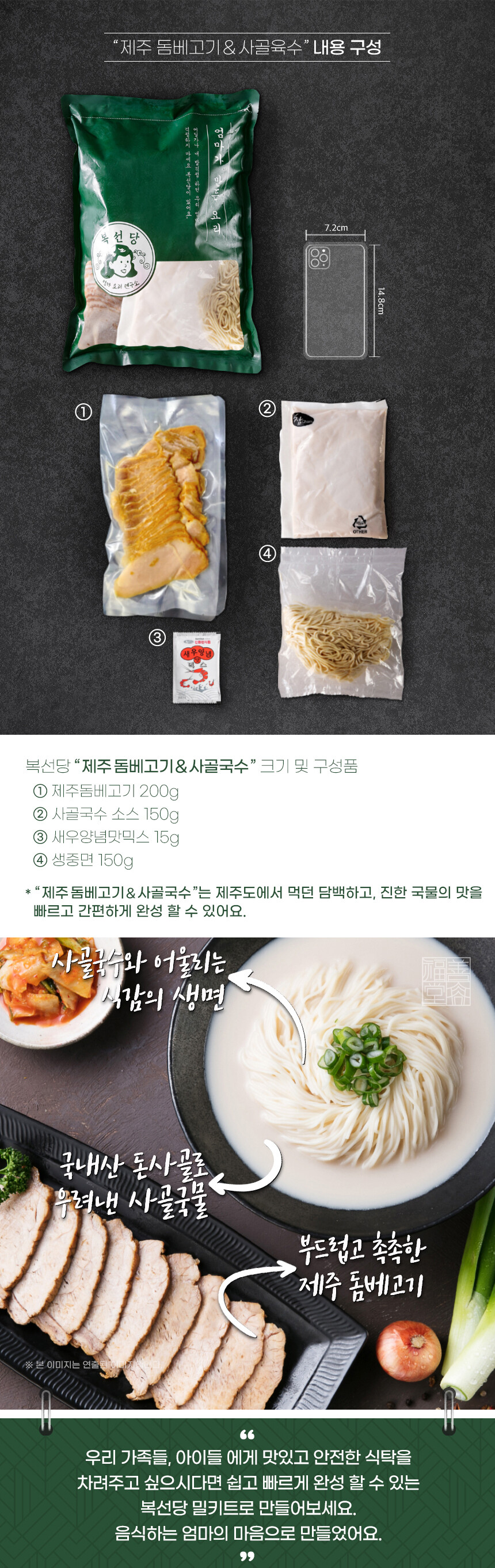 긴 조리시간과 각종 재료의 구매, 손질와 삶는 시간등은 조리에 앞서 늘 고민이셨죠? 그런 고민을 해결해드릴 "제주돔베고기 & 사골국수", 제주 고기국수는 깔끔하게 손질한 재료와 위생적이며 바른 레시피만을 고집하여 만들어 어린이부터 어른까지 온 가족이 식사로도 간식으로도 맛있게 즐길 수 있습니다. 제주도 돼지고기와 국내산 사골육수, 쫄깃한 국수면으로 맛을 낸 "제주돔베고기 & 사골국수", 제주 고기국수를 지금 바로 경험해 보세요!