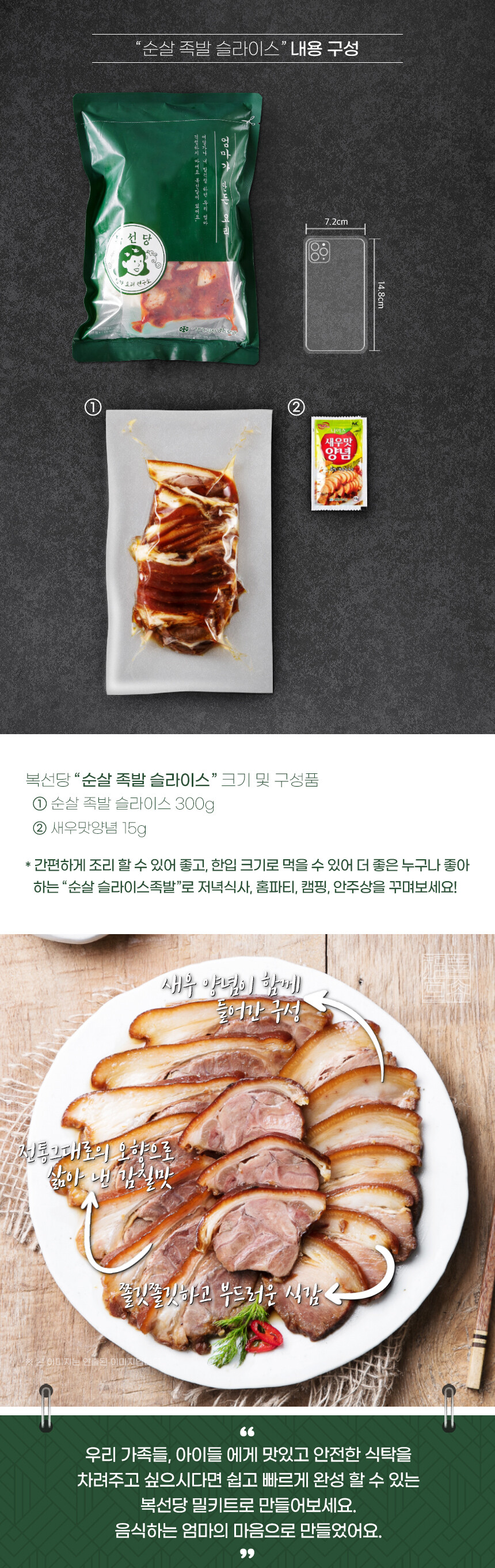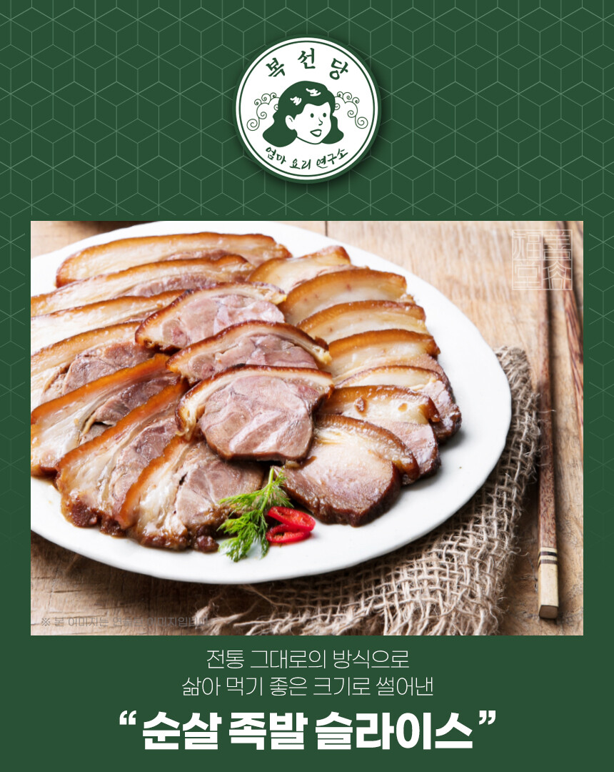 가정에서의 식사, 안주는 물론 학교나 기업, 군대, 군납 급식으로도 아주 좋은 특별한 순살 족발을 만나보세요. 좋은 재료의 깨끗하고 위생적인 손질에서부터 바른 레시피로 맛있게 만들어 언제 어디에서나 메인 메뉴로 손색이 없어요. 오향족발을 한입 크기로 슬라이스하여 먹기 편하게 썰어 쉽고 빠른 조리법에 더해 맛까지 채워 높은 퀄리티에 만족하실거에요.